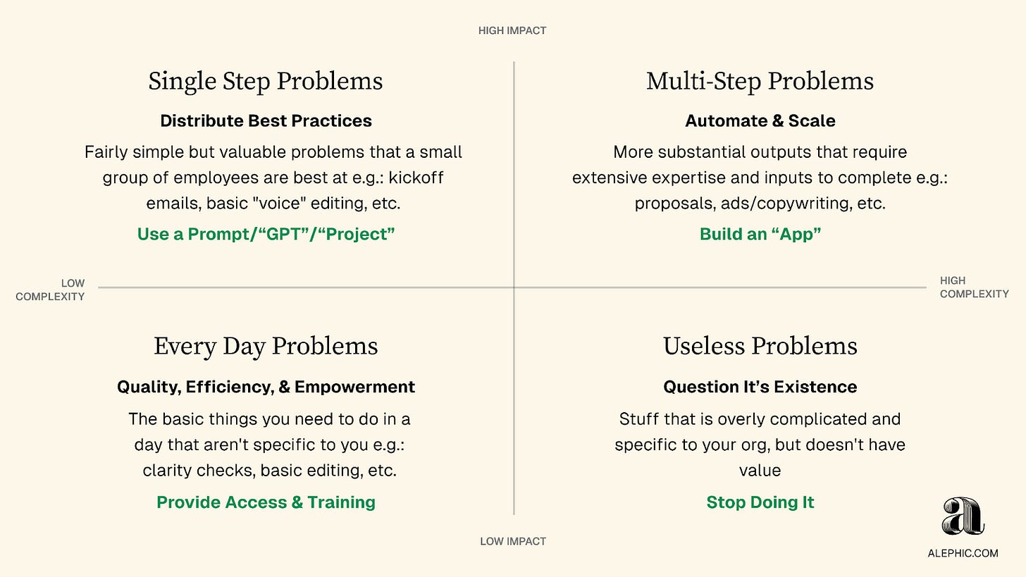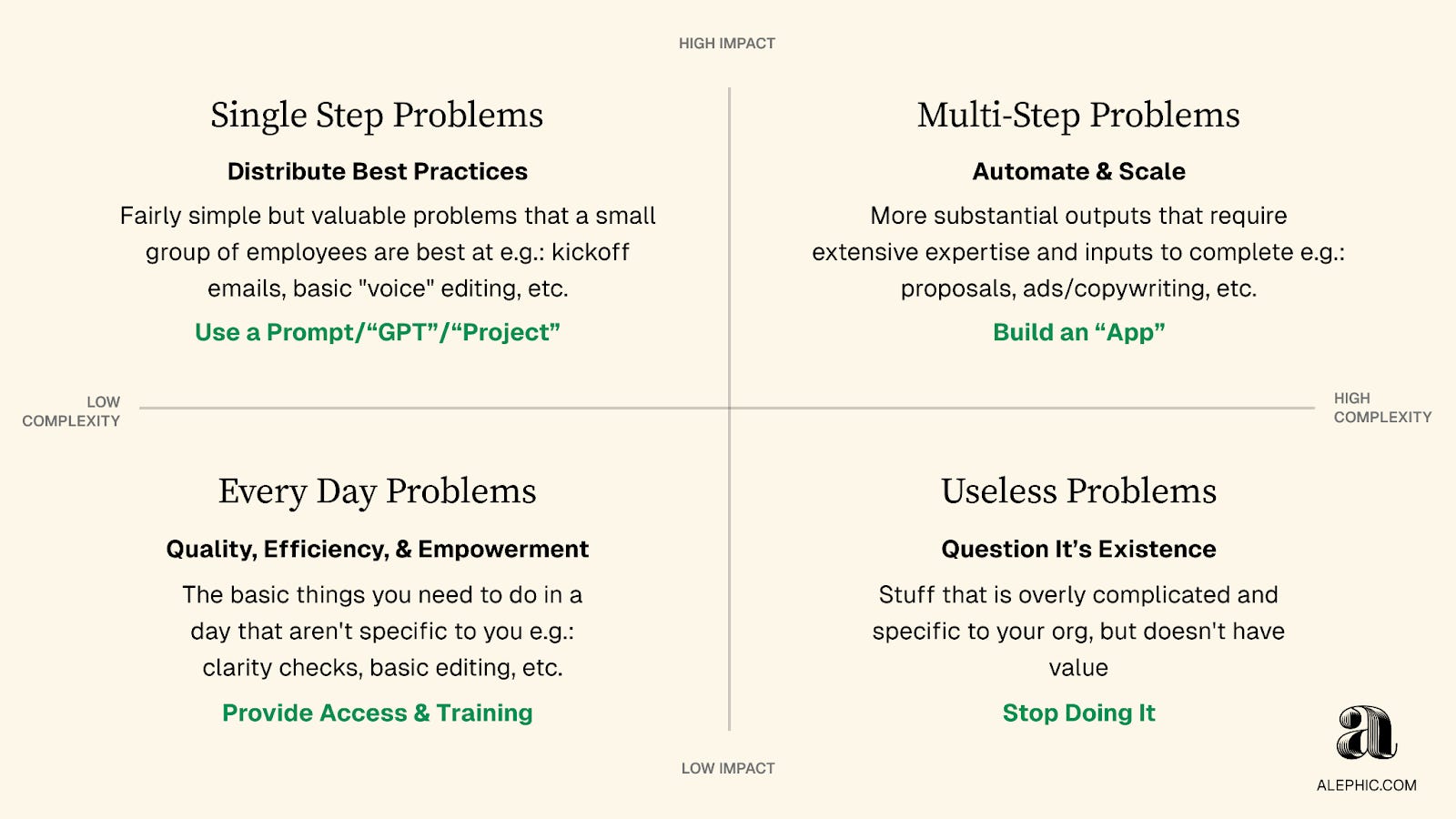 The idea for that top-left quadrant represents a sweet spot where you can effectively distribute specific knowledge. It's about capturing basic yet valuable ways of working that don't require complex multi-step workflows but, when distributed, can significantly raise the bar for the entire organization. A prime example I often use is writing kickoff emails. While this task can typically be handled in a single pass by AI given good inputs, the quality of the output heavily depends on the individual's understanding of what truly matters in these communications. By codifying this knowledge into AI prompts or tools, you're essentially democratizing expertise across the organization.