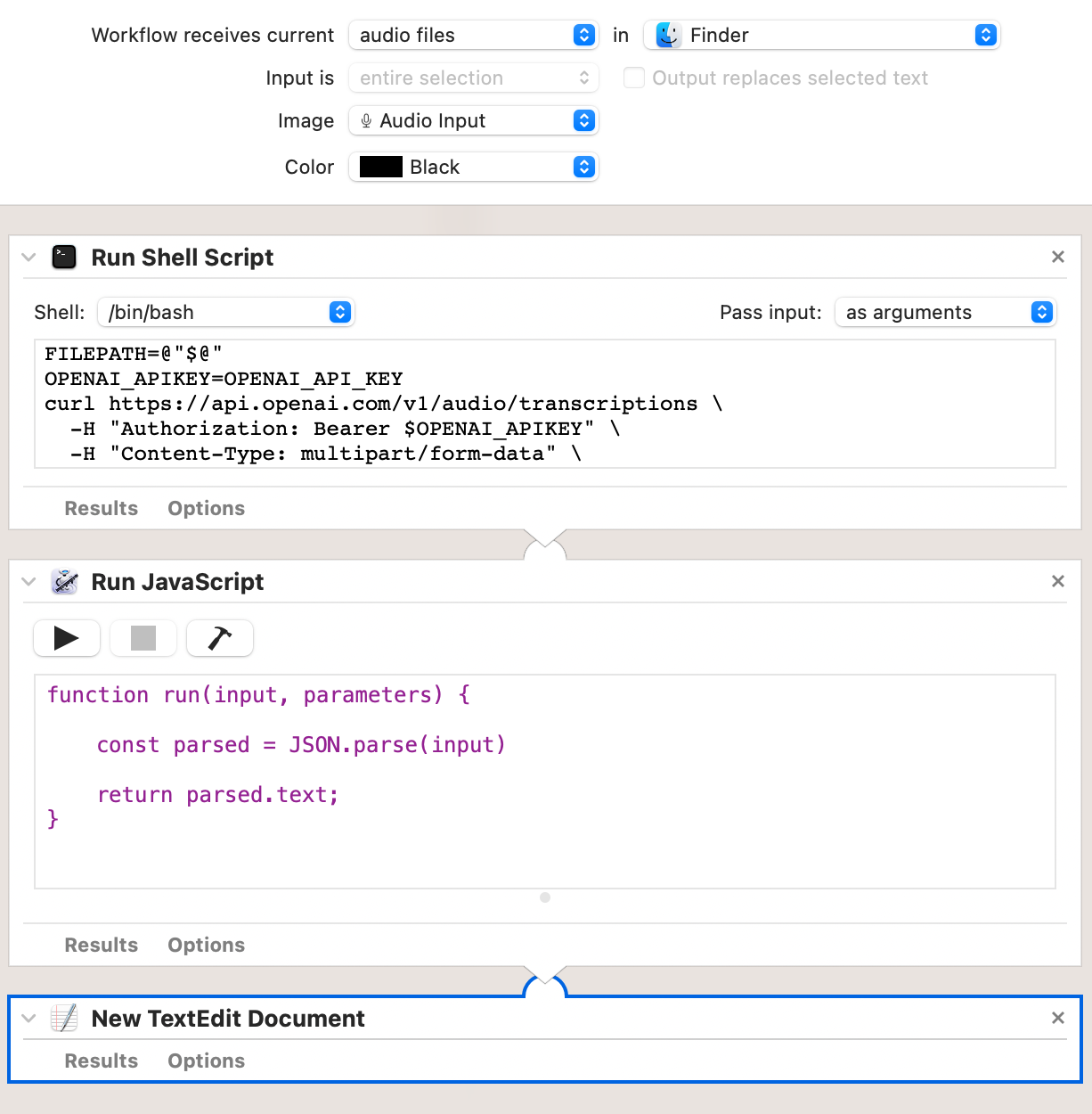 If you haven’t played with OpenAI’s new open-source speech-to-text model Whisper, it’s amazing—by far the best transcription model I’ve ever used. While I still have an Otter subscription, I was finding myself frequently running stuff back through Whisper to get something better. To that end, it was getting annoying to keep having to run a curl command in the terminal to send the audio file to OpenAI (while the model is open source, OpenAI has a paid API that costs $0.006 per minute and is extremely fast (alternatively, you can also run it locally).