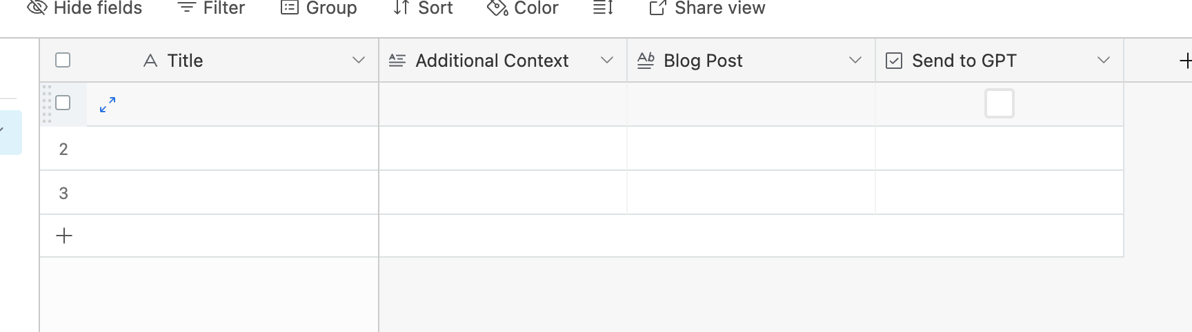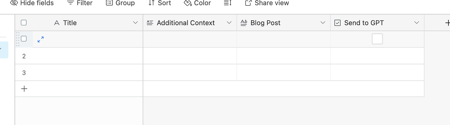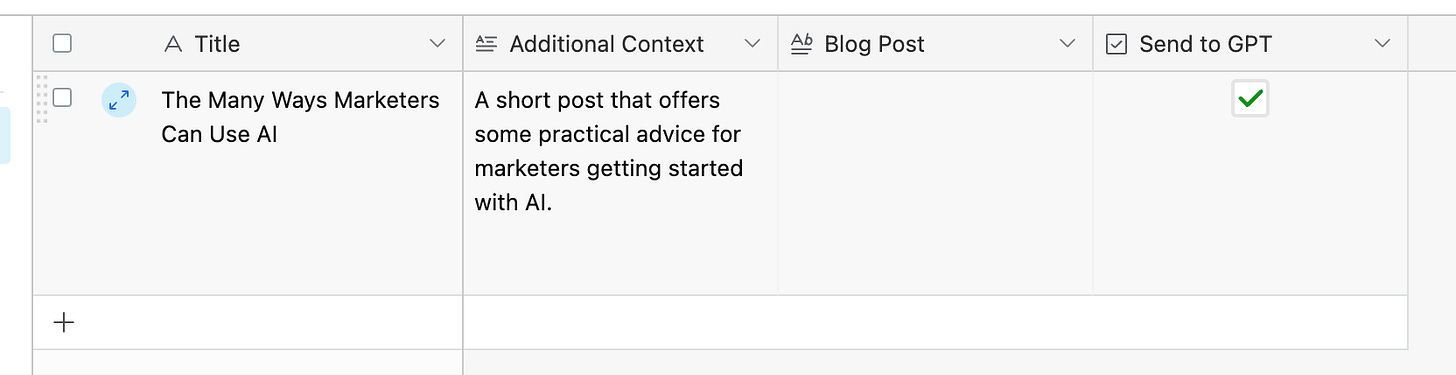 The basic idea is that we will write our post titles and offer a bit of additional context about what we want out of the post. When we’ve added everything we need, we will use the Send to GPT checkbox to trigger everything. From there, once we set everything up, OpenAI will generate a post and it will be added to the Blog Post column.