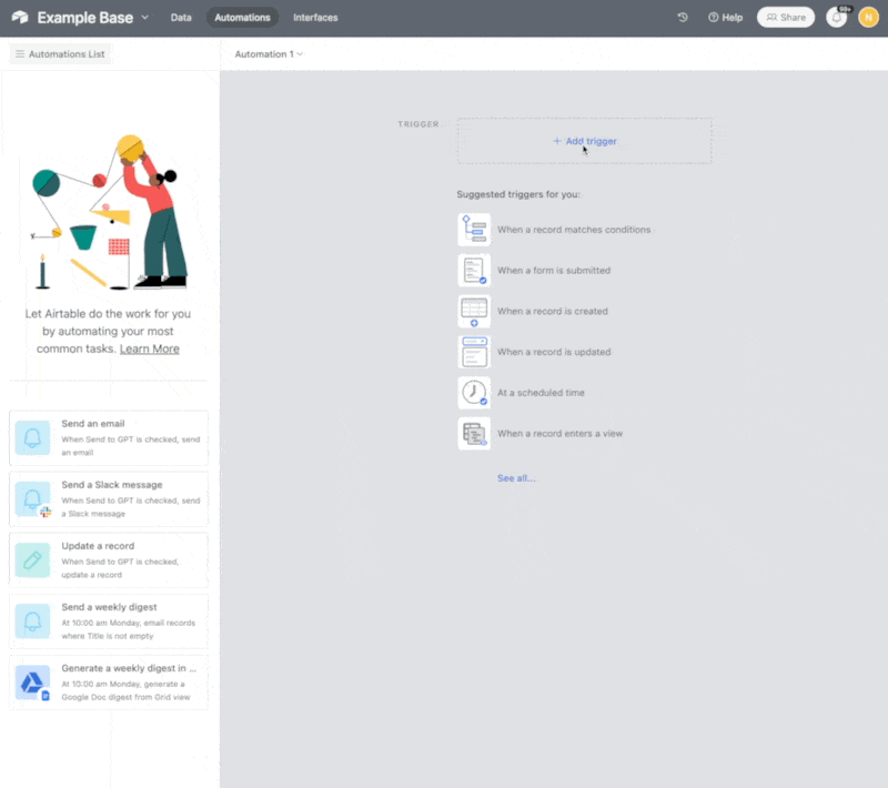 After the basic setup of our Base, let’s create a new view called Send to GPT. Views allow you to filter the information in a base as determined by the content. This is particularly useful for Automations, which can be triggered when a new item enters a view. You set these up with filters.