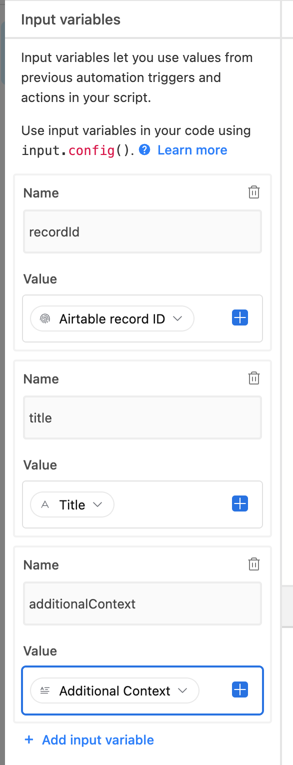 This will give us the coding interface we can use to call GPT3. When you click it, you should open up an Edit Script screen. The left side is “Input Variables,” which determines which fields from the item that triggered the automation we want to pass into our script. For our purposes, we want three things: