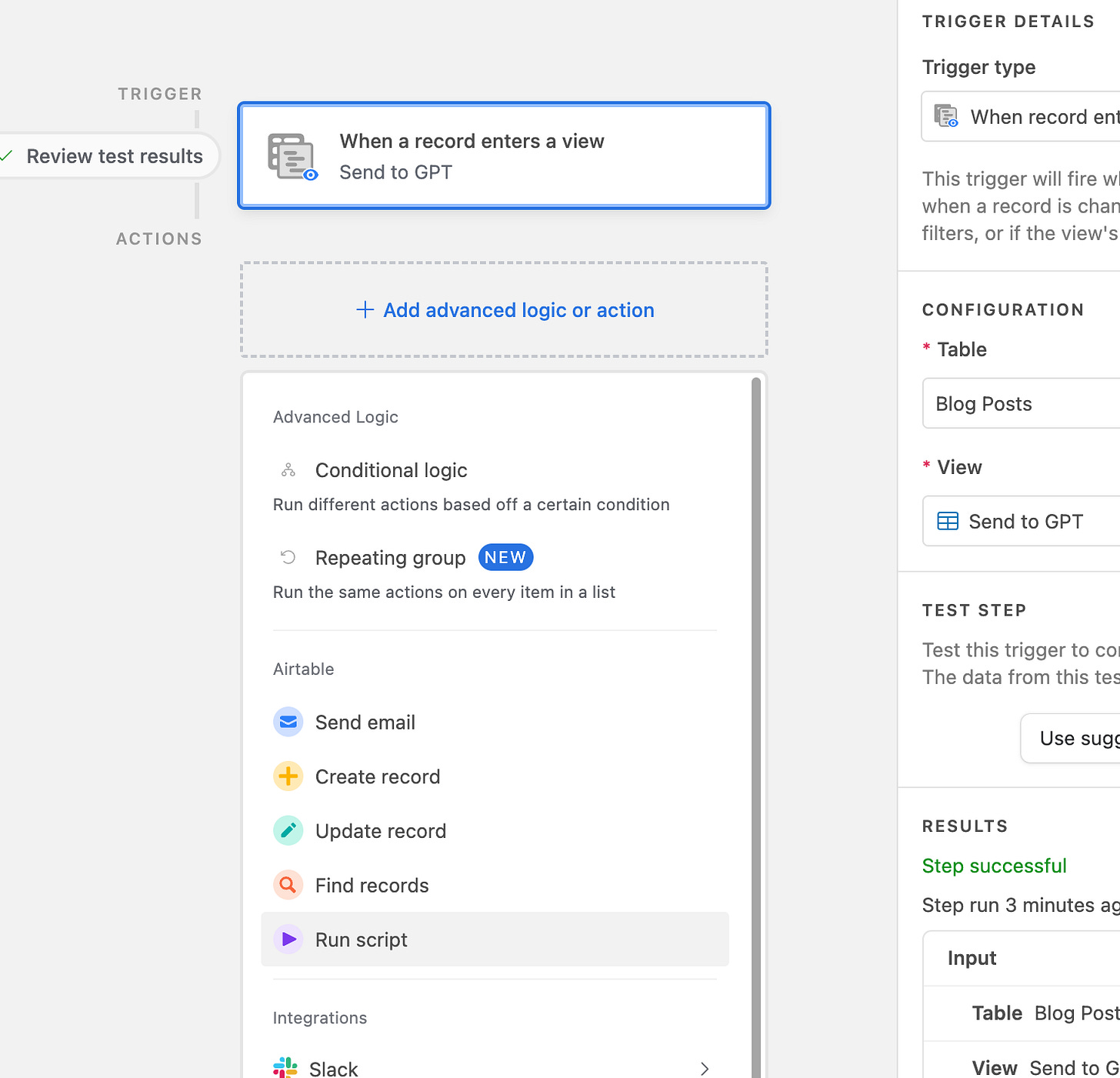That means that each time an item enters the Send to GPT View (which tells us it has a title, context, the send to GPT box is checked, and it has no blog post yet), it will trigger this automation to run. So if you’re wondering where the AI comes in, we’re finally there.