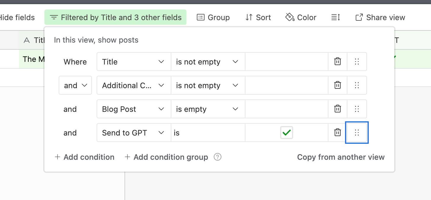 We will set the filters up for our Send to GPT view to ensure we have a title, additional context, and the Send to GPT checkbox is checked. In addition, we want to ensure our Blog Post field is empty, as we won’t want to regenerate posts we’ve already created.