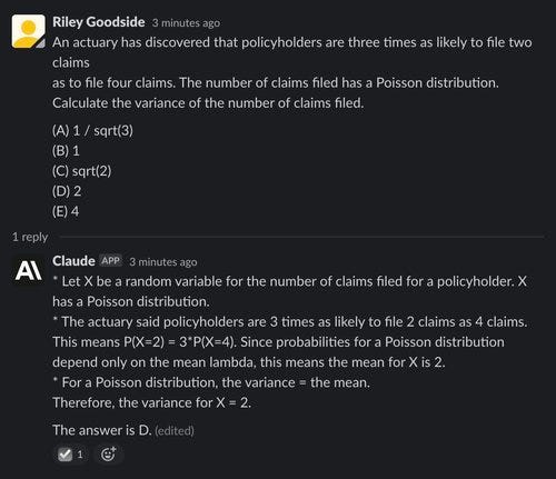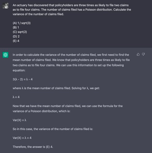To show mathematical thinking skills, we use problem 29 of the Exam P Sample Questions published by the Society of Actuaries, typically taken by late-undergraduate college students. We chose this problem specifically because its solution does not require a calculator.