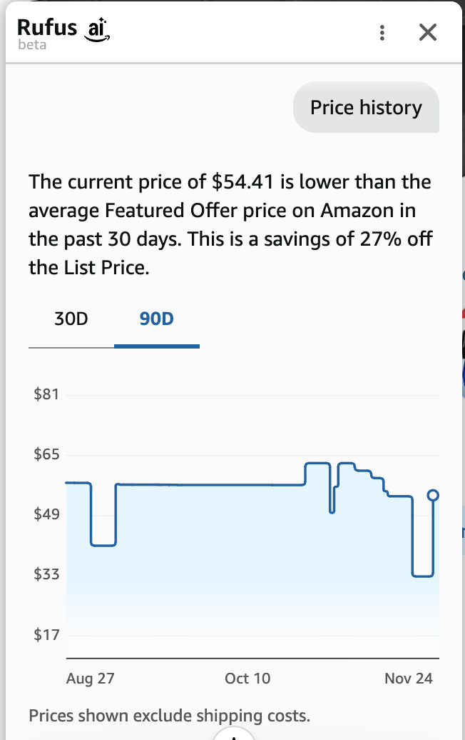 Amazon’s Rufus AI assistant now shows 30- and 90-day price history on any product—just ask “show me price history.” You can even set price alerts to get notified when something hits your target price, and Prime members can enable auto-buy to have Rufus automatically purchase it when the price drops. This is Amazon acknowledging that price transparency matters, even if it cuts into their dynamic pricing advantage. Rufus also handles handwritten grocery lists now (snap a photo, it adds items to cart), searches across other retailers with “Buy for Me” buttons, and has account memory so it remembers if you, for example, have a golden retriever that sheds.