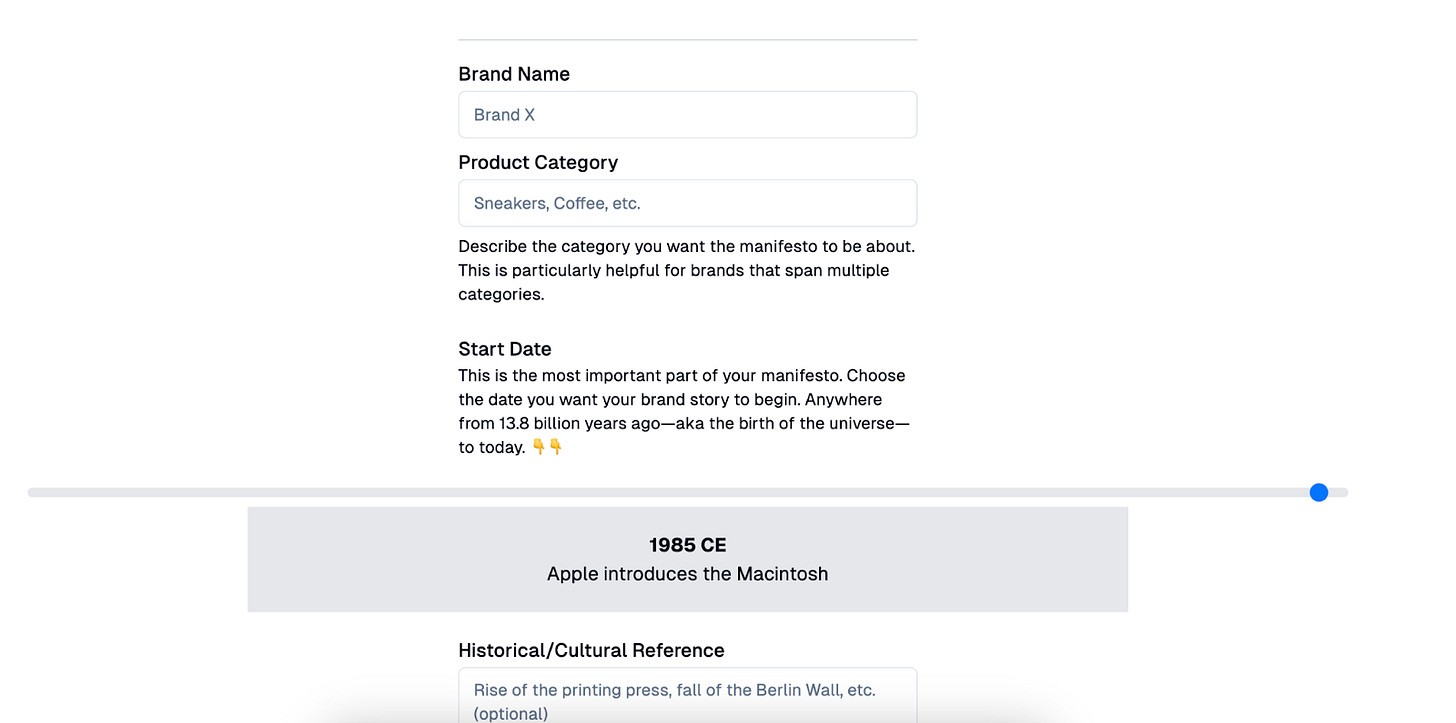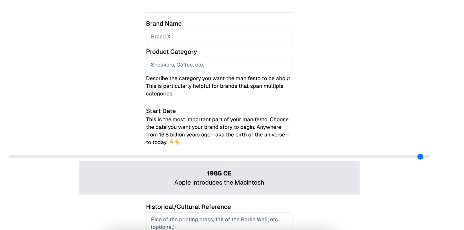 In case you missed it, last week, I launched the Manifesto Machine, an AI manifesto generator I built in collaboration with Michael Grant. I wrote a bunch about it last week, but the idea is pretty simple: You use the form below, and the AI does the work of writing (and narrating) a brand manifesto. Like lots of the experiments I do, it’s not meant to be a thing that replaces human creativity, but rather an exploration of how this technology works and what it might mean for brands.