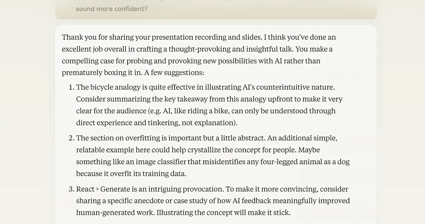 While working on my presentation for the NYC conference in May, I did what I always do: write an extended essay version, turn it into slides, and trim it down by running through the presentation. After I felt pretty good about it, I recorded myself giving the presentation and then gave Claude the PDF, the transcription of my presentation, and the original script and asked for tough feedback. What came back was terrific, particularly the bit that suggested I needed to bulk up my “React > Generate” by “sharing a specific anecdote or case study of how AI feedback meaningfully improved human-generated work. Illustrating the concept will make it stick.”