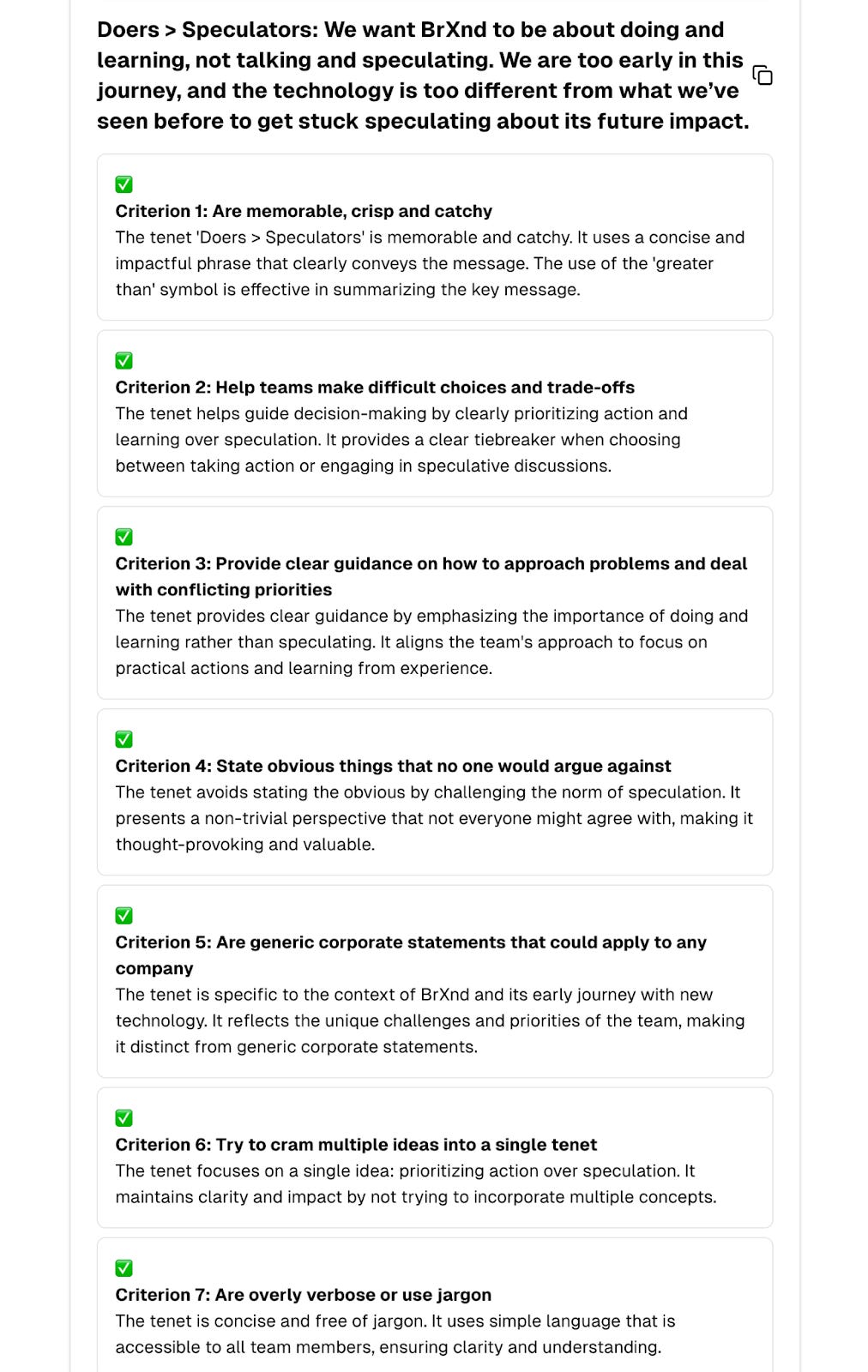 For more structured problems, building tools that can enumerate the principles and give feedback on them individually is incredibly powerful. For a recent project, we built a tenet analyzer. Tenets, if you’re not familiar, come out of Amazon and ultimately represent the guiding principles of a team. They are meant to go well beyond generic values by helping people actually make difficult decisions and trade-offs and not being generic. This presents a perfect opportunity to use AI as a feedback tool, helping someone refine their output. As a simple example, here’s the output when I put in the BRXND programming tenet “Doers > Speculators:”