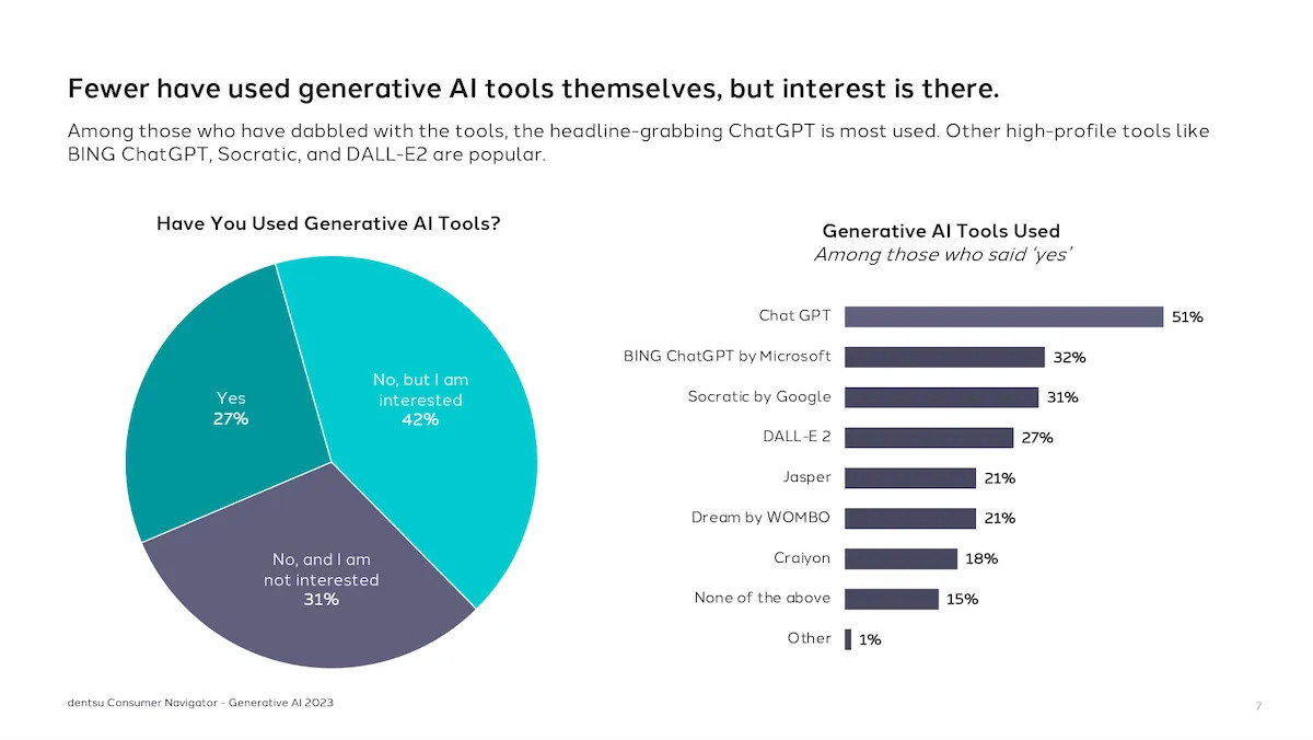 Text-to-Video is going to be big. Bigger than Text-to-Image, I think. Right now, the tools are reminiscent of the early image generation days with apps like StarryAI and Wombo Dream—video is about a year behind images. But Dentsu just released research that about 27% of the US online population has already used some type of Generative AI tool, so it’s likely that when everyone can create videos on a whim, it will be explosive.