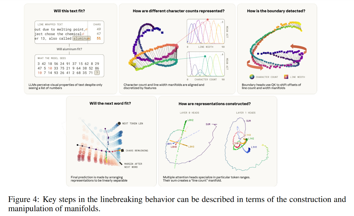 On the more technical side: Anthropic researchers reverse-engineered how Claude performs character counting and found it doesn’t use anything like integer registers. Instead, it encodes counts as a spiraling “character count manifold” in the residual stream via geometric rotations across attention heads. Transformers solve discrete counting through continuous geometry. 🤯