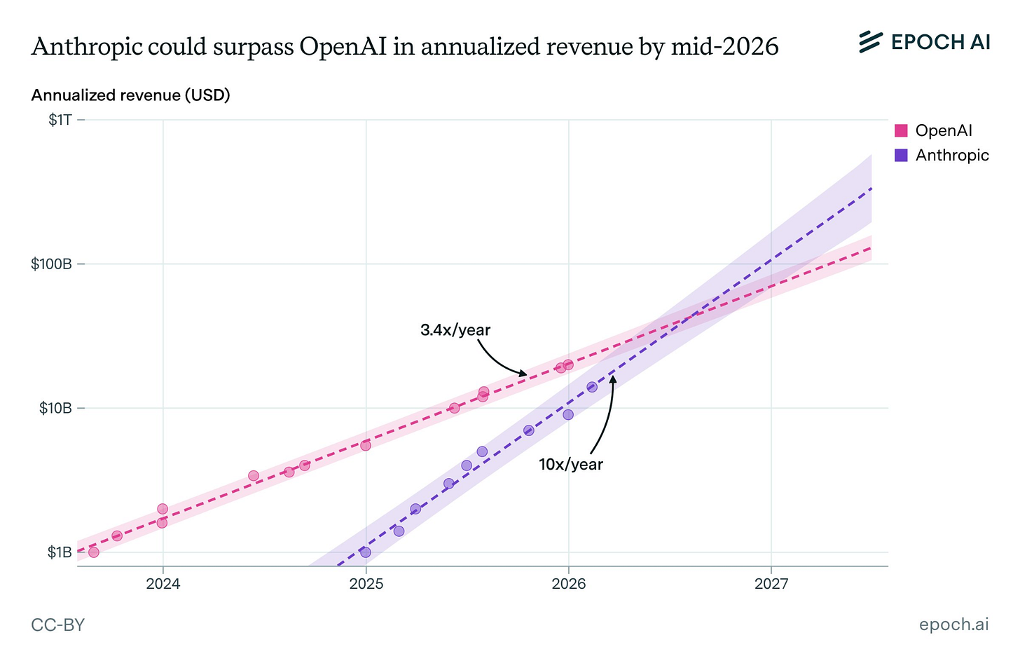 Epoch AI data shows Anthropic growing revenue 10x per year since hitting $1B in annualized revenue, versus OpenAI’s 3.4x. If those trajectories hold, Anthropic could overtake OpenAI by mid-2026.