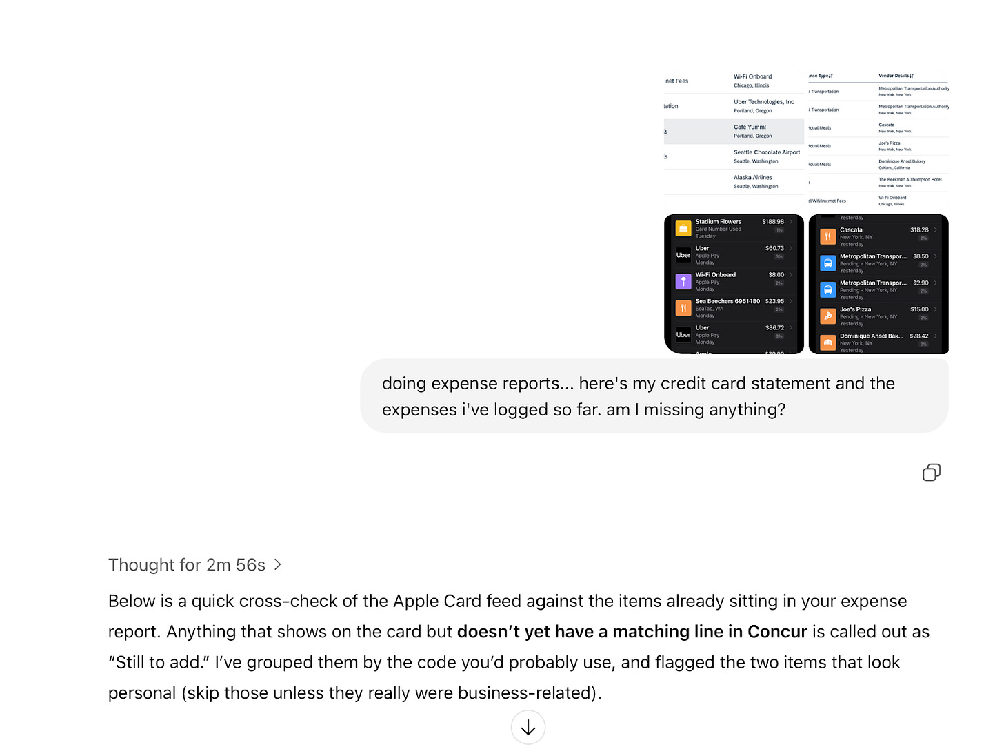 I mean, Veo / Midjourney video / Suno still blow my mind every time. But a thing I’ve gotten used to lately is just having AI double-check all kinds of things for me. I am super forgetful with expense reports and probably end up not expensing like 20% of things because I forget. Now I screengrab my report before submitting, upload my credit card statements, and ask o3 if I’m missing anything.